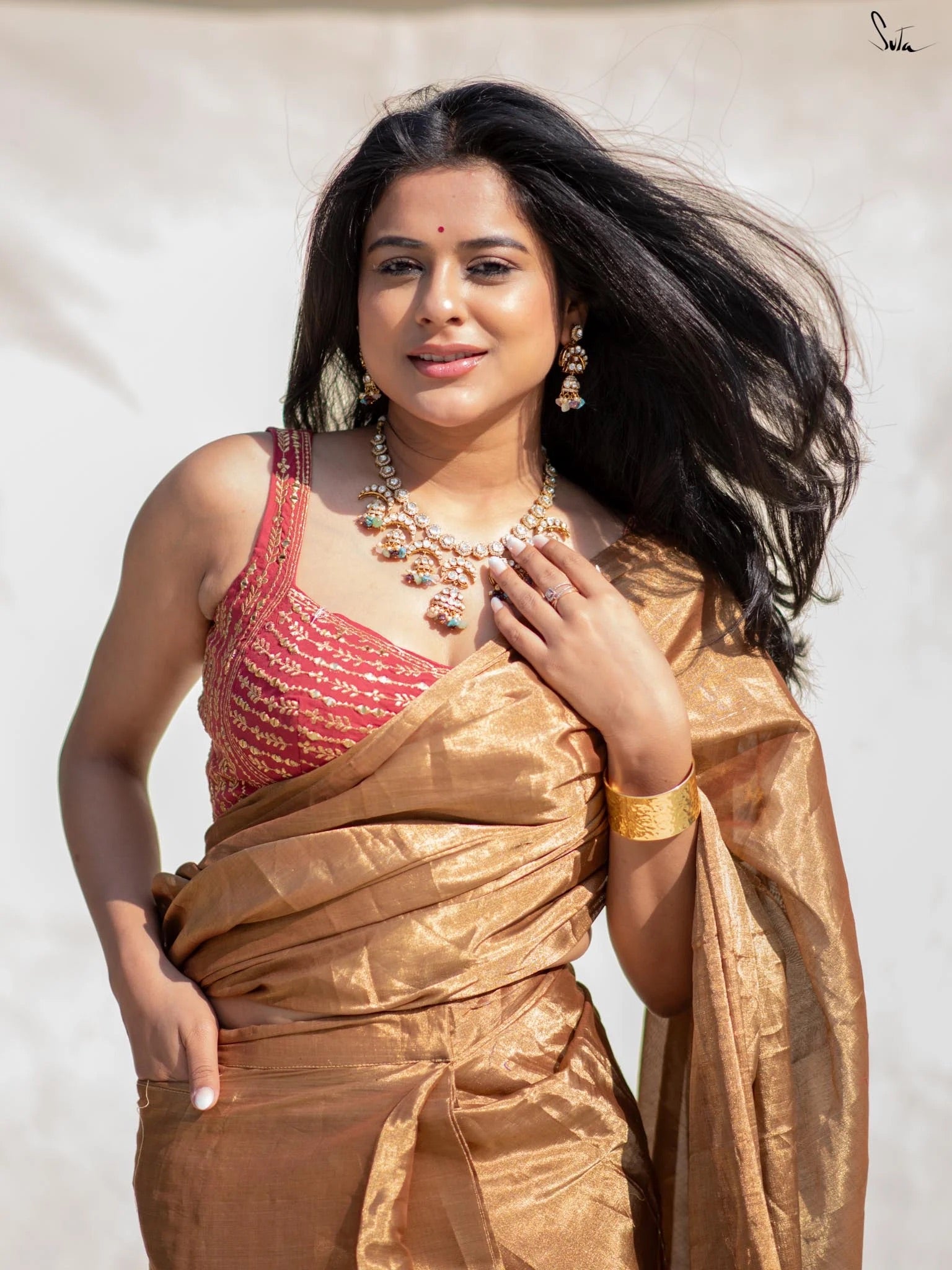 Handwoven in Chanderi with silk, cotton, and zari, this saree is light on the body and rich in detail. The soft gold fabric catches the light just enough to feel festive, never loud. With a pre-draped silhouette, it slips on with ease—no pleats, no pins. A piece to wear now, and hold onto for years. This is a pre-draped saree.